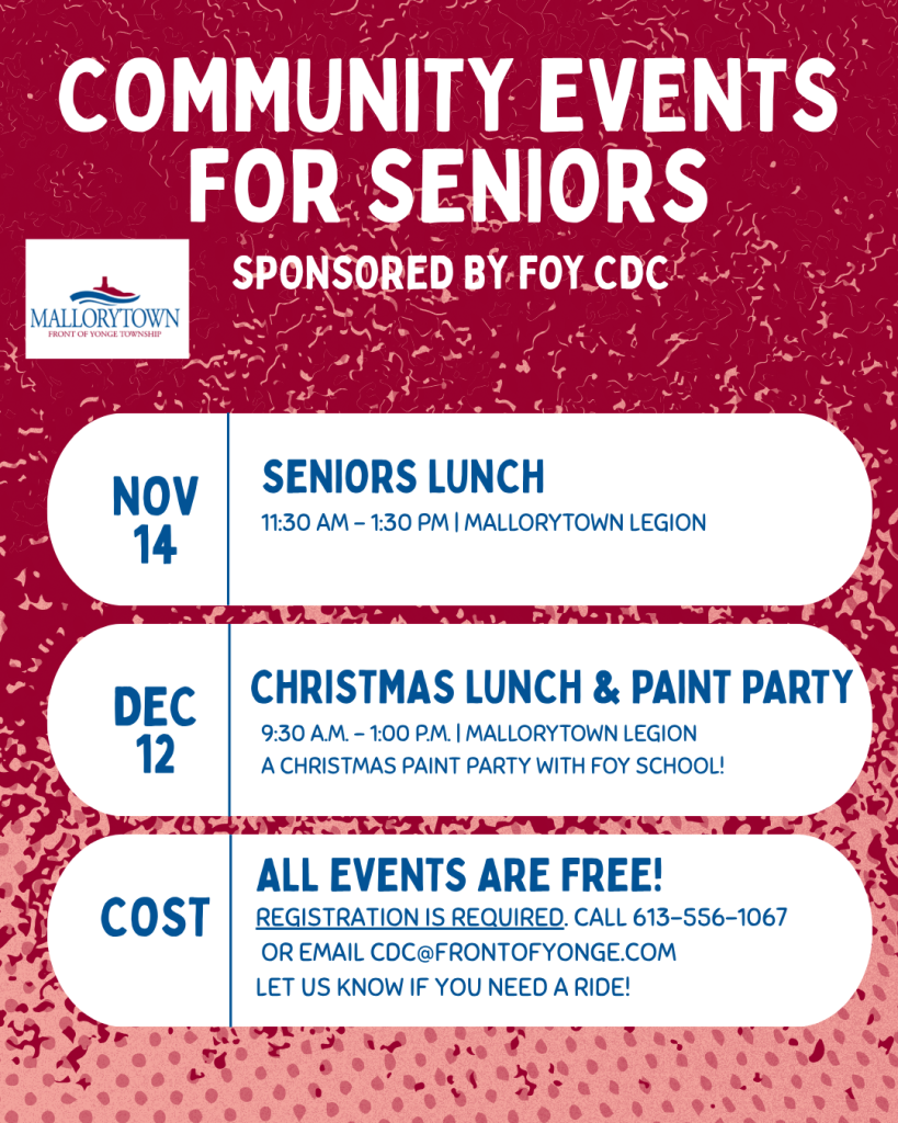 Free Seniors Lunch 11:30am + Add to Google Calendar + iCal / Outlook export 00 days 00 hours 00 minutes 00 seconds WELCOME TO FRONT OF YONGE TOWNSHIP Small town rural life along the beautiful St. Lawrence River with all the services and benefits you need SEE WHAT MAKES US "YONGE"! Quick Links QUICK LINKS Mallory Coach House Biosphere Hiking Trails Mallorytown Library Annual Events Newsletter Subscription First name or full name Email By continuing, you accept the privacy policy NEWS Public Survey – Leeds County OPP Detachment 2026-2029 Action Plan November 5, 2025 Final Property Tax Instalment October 6, 2025 Notice to Residents: Waste Disposal Site Fee Increase May 22, 2025 VISITORSAccommodations Annual Events Business Directory Christmas Parade Directions and Map Mallory Coach House Mallorytown Station Partners Tourist Information Trails NEWS Public Survey – Leeds County OPP Detachment 2026-2029 Action Plan November 5, 2025 Final Property Tax Instalment October 6, 2025 Notice to Residents: Waste Disposal Site Fee Increase May 22, 2025