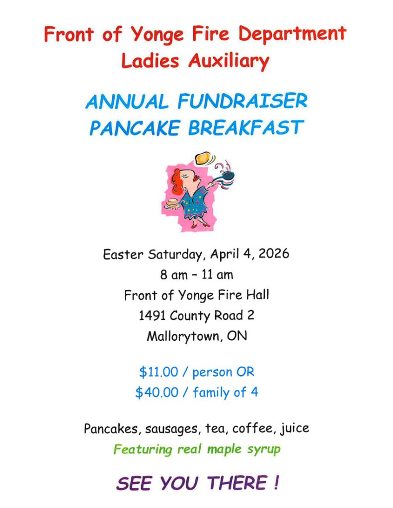 Pancake Breakfast 8am + Add to Google Calendar + iCal / Outlook export WELCOME TO FRONT OF YONGE TOWNSHIP Small town rural life along the beautiful St. Lawrence River with all the services and benefits you need SEE WHAT MAKES US "YONGE"! Quick Links QUICK LINKS Mallory Coach House Biosphere Hiking Trails Mallorytown Library Annual Events Newsletter Subscription First name or full name Email By continuing, you accept the privacy policy NEWS Opportunity to Comment: Proposed Expansion of Charleston Lake Provincial Park March 27, 2026 2026 Household Hazardous Waste Days March 16, 2026 Information Session – “So You Want to Run for Council” March 16, 2026 VISITORSAccommodations Annual Events Business Directory Christmas Parade Directions and Map Mallory Coach House Mallorytown Station Partners Tourist Information Trails NEWS Opportunity to Comment: Proposed Expansion of Charleston Lake Provincial Park March 27, 2026 2026 Household Hazardous Waste Days March 16, 2026 Information Session – “So You Want to Run for Council” March 16, 2026
